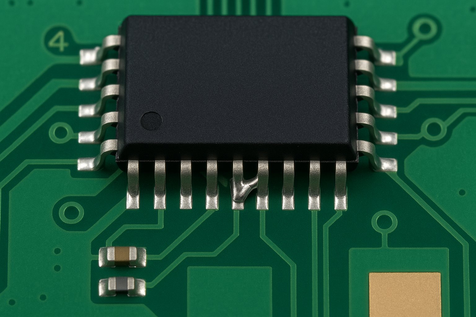 Solder bridging happens when excess solder connects adjacent pads or leads, forming an unintended short circuit. Common causes include too much solder paste, poor stencil design, or misalignment during reflow soldering.