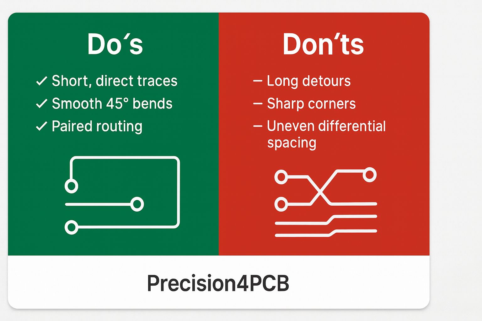 - Keep high-speed traces short, straight, and without unnecessary detours.