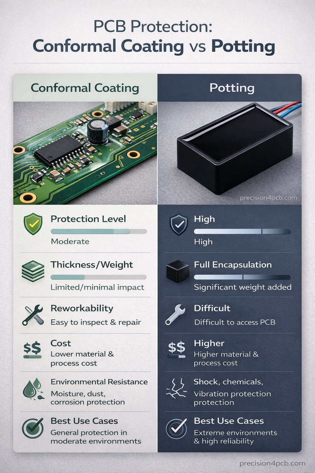 Two of the most commonly used protective solutions for PCBs are conformal coatings and potting (encapsulation). While both serve to shield PCBs from moisture, dust, chemicals, vibration and temperature stress, they differ significantly in application, performance, maintenance, and cost.